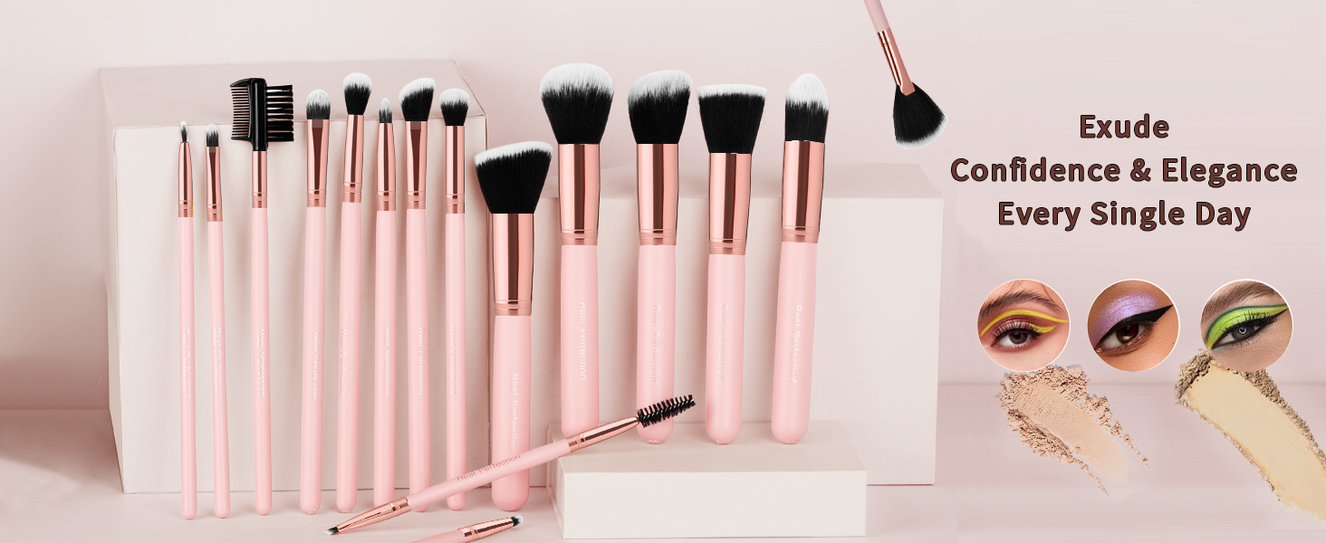Real Perfection 化妝刷組 16 件組 附 1 支眉刀 優質合成粉底粉 遮瑕膏 眼影腮紅 化妝刷 化妝刷組 (粉紅色)